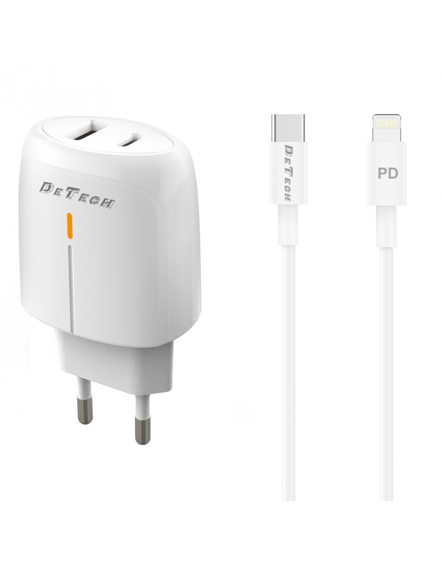 Мрежово зарядно устройство DeTech DE-31PDL, 20W, С Type-C към Lightning кабел, 1 x Type-C F, 1 x USB F, PD, QC, Бял - 40323