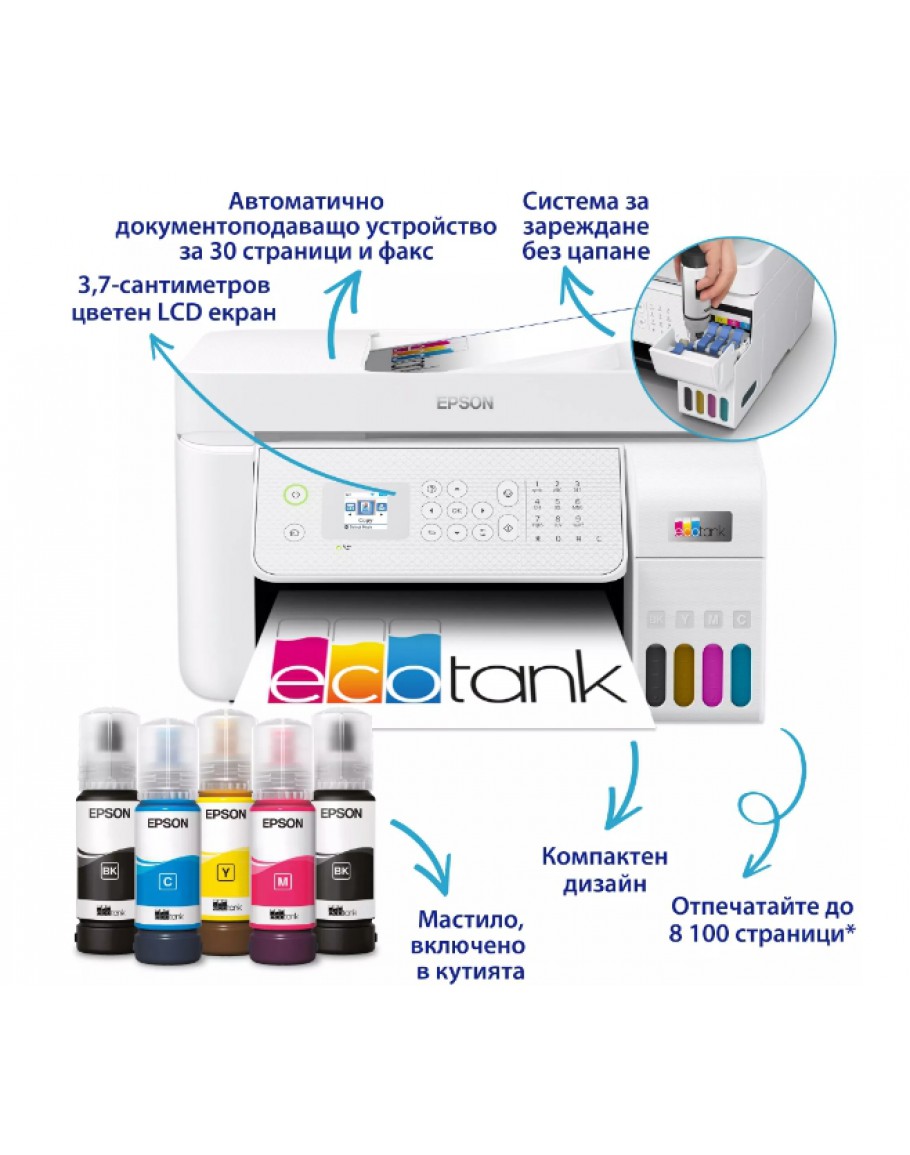 | Консумативи | 103 EcoTank Cyan Ink Bottle, 103 EcoTank Black Ink Bottle, 103 EcoTank Magenta Ink Bottle, 103 EcoTank Yellow Ink Bottle | |