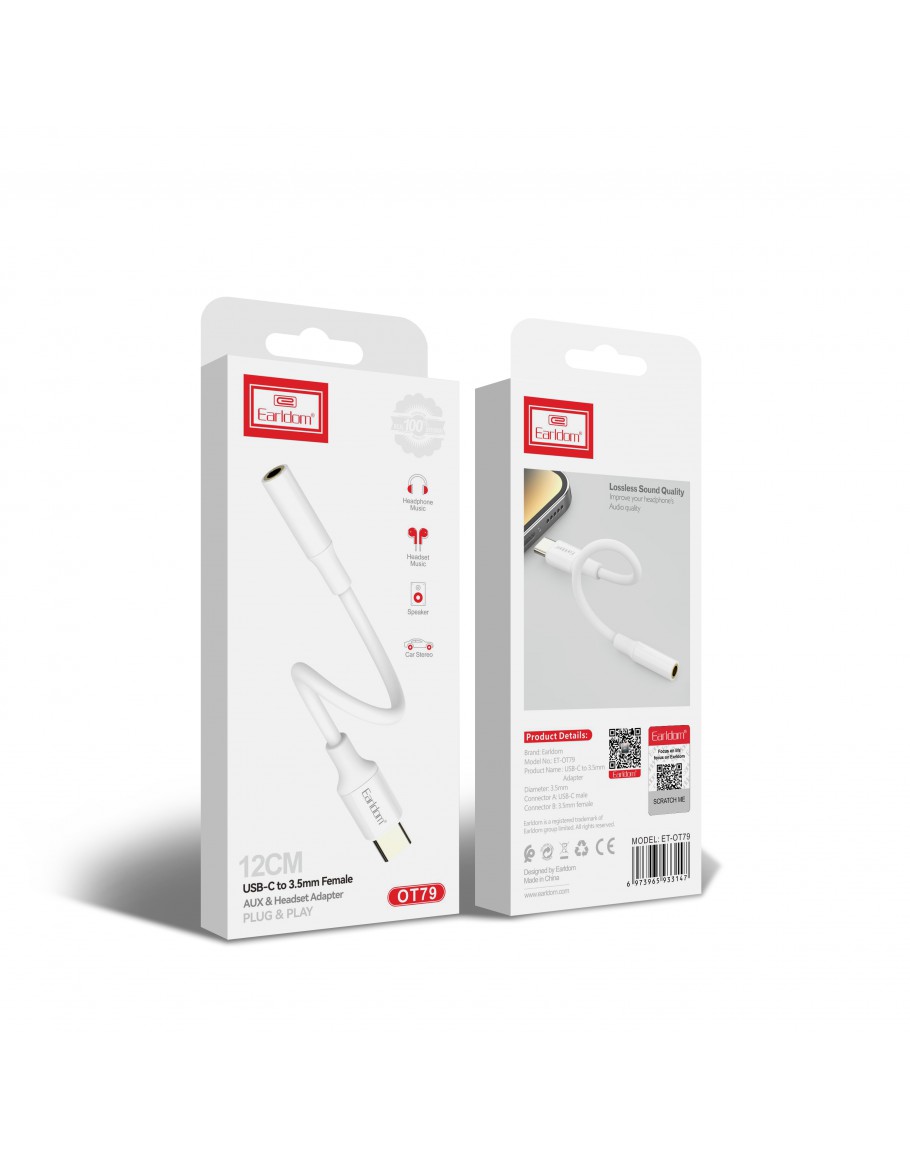 Преходник Earldom ET-OT79, Type-C към 3.5мм (F), Бял - 40362