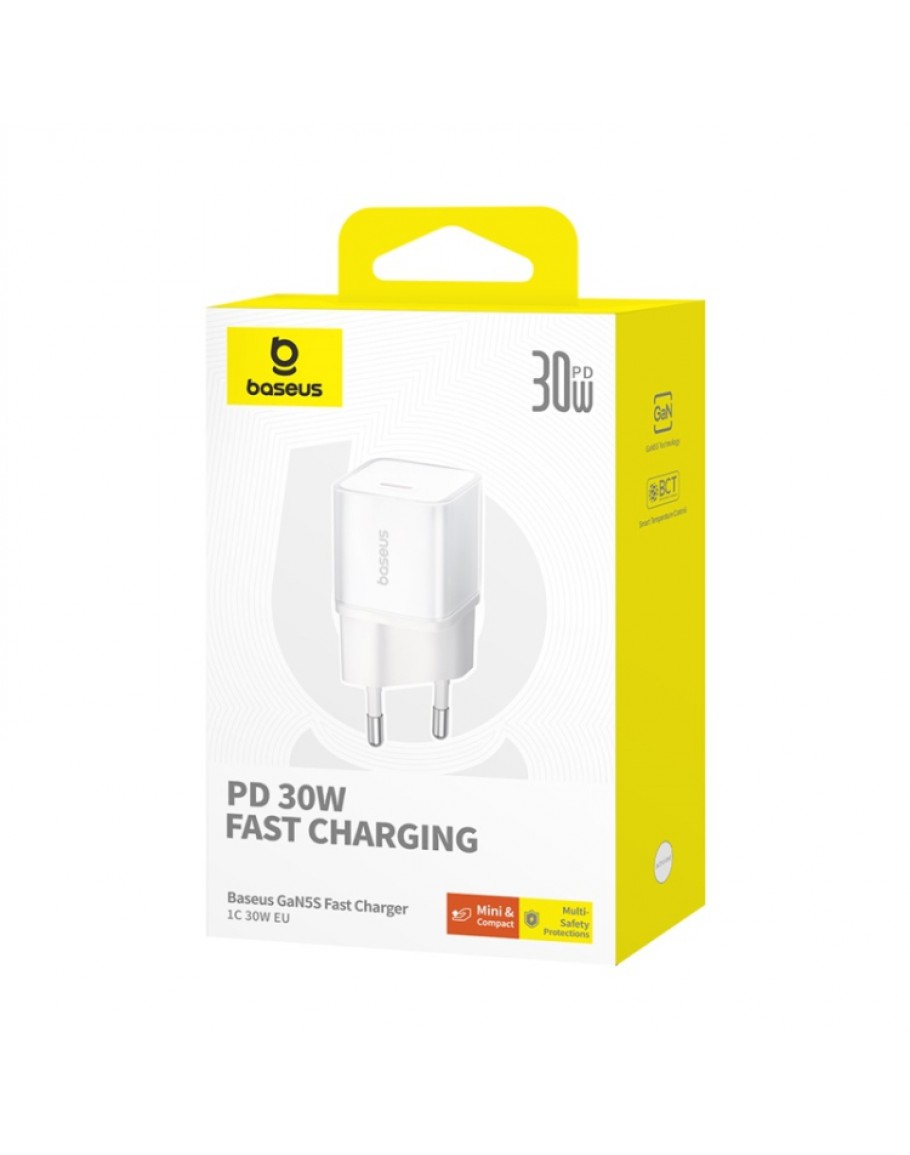 Мрежово зарядно устройство Baseus GaN5S Fast Charger 1C, 30W, 1 x Type-C F, Бял - 40405