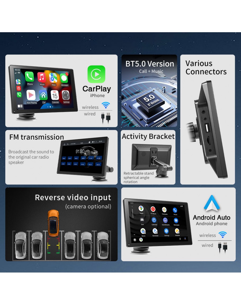 Свързва се безжично към вашия смартфон чрез Bluetooth, елиминирайки необходимостта от кабели или допълнителни адаптери. Освен това преносимият CarPlay / Android Auto дисплей може лесно да се монтира на таблото във всяка кола. Също така той разполага със система за захранване, която гарантира, че устройството остава заредено по време на употреба.