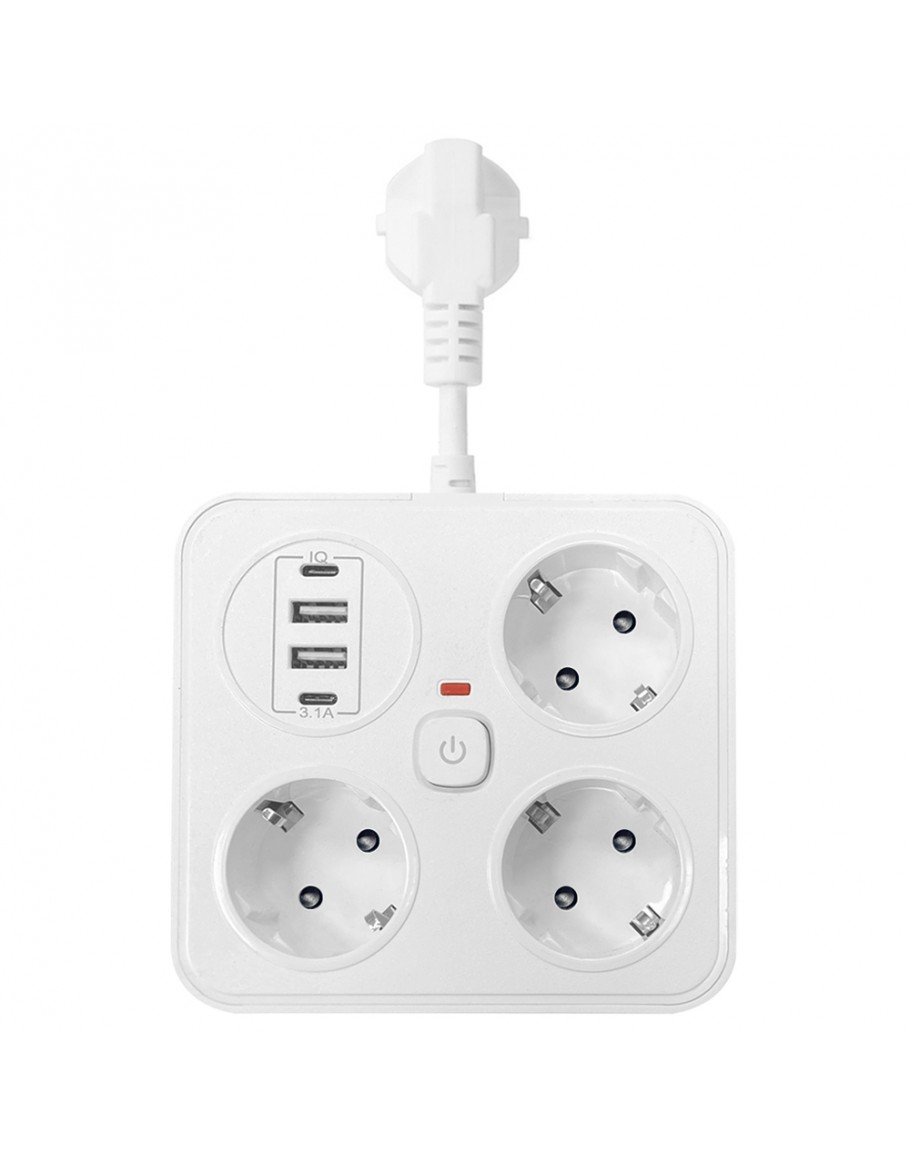 Удължител No brand, 3 гнезда, 250V, 10A, Кабел, 1.8м., 2 x USB-F, 2 x USB-C, С ключ, Бял - 17964
