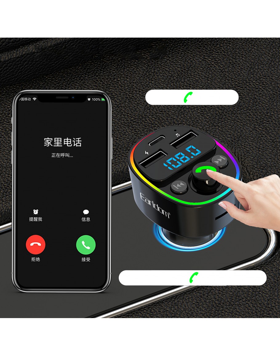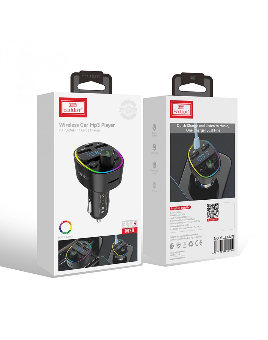 FM Трансмитер Earldom ET-M78, Bluetooth, Micro SD, USB, Type-C, QC, Черен - 17776