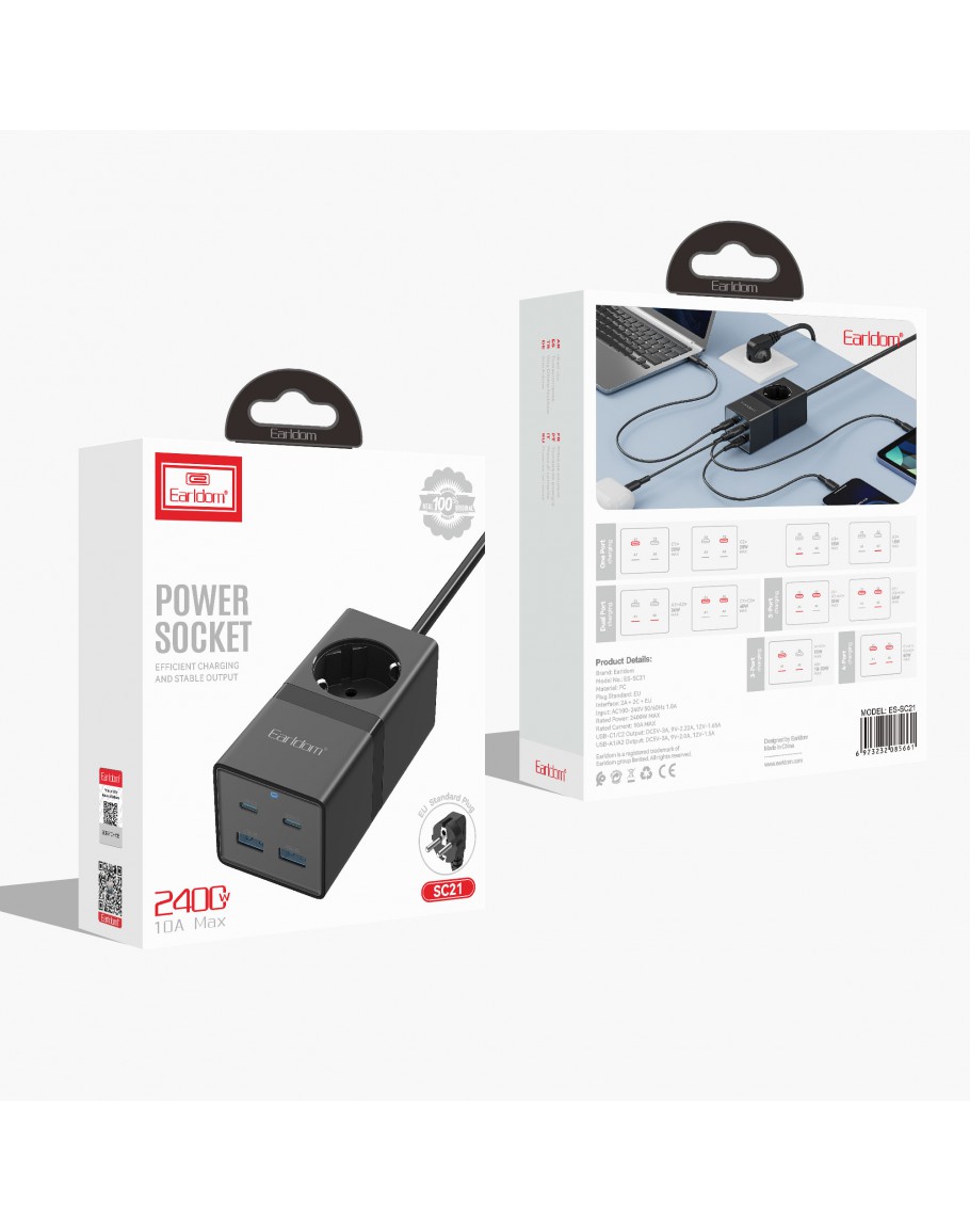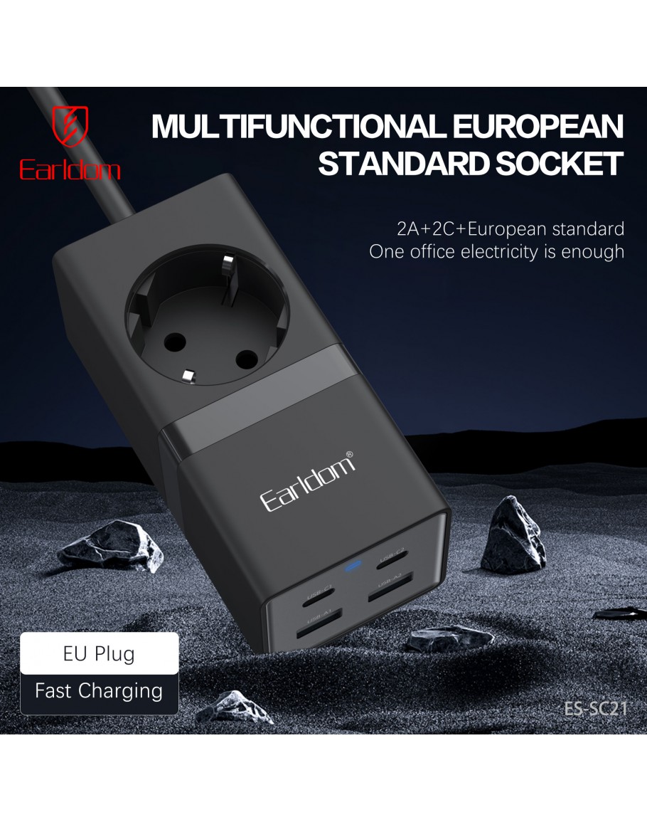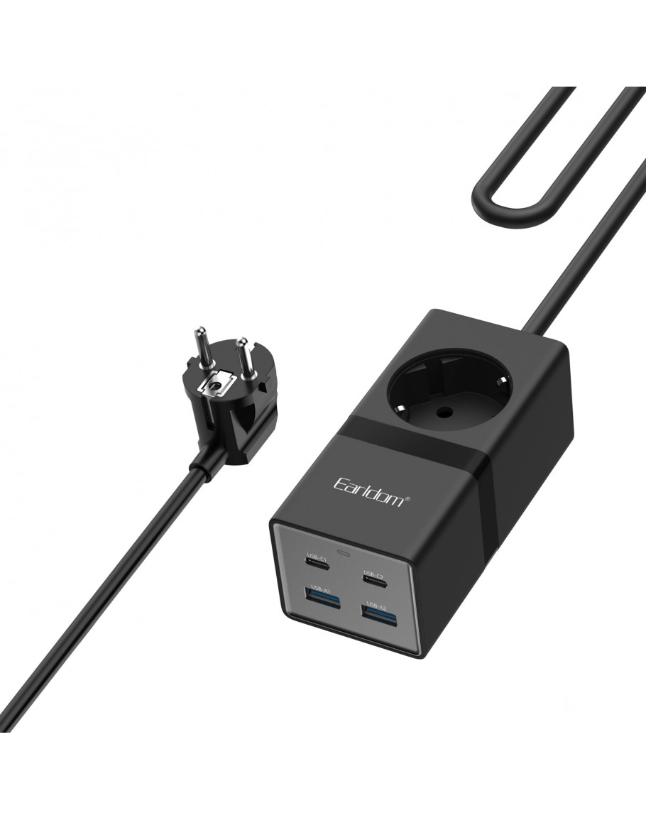 Удължител Earldom ES-SC21, 1 гнездо, CEE 7/3, 2 х USB F, 2 x USB-C, 1м., Черен - 40521