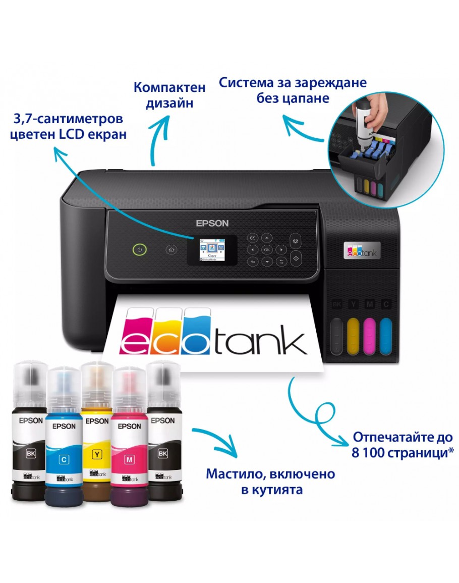 | Консумативи | 103 EcoTank Black ink bottle (Up to 4500 pages); 103 EcoTank Cyan/Magenta/Yellow ink bottles (Up to 7500 pages each color) | |
