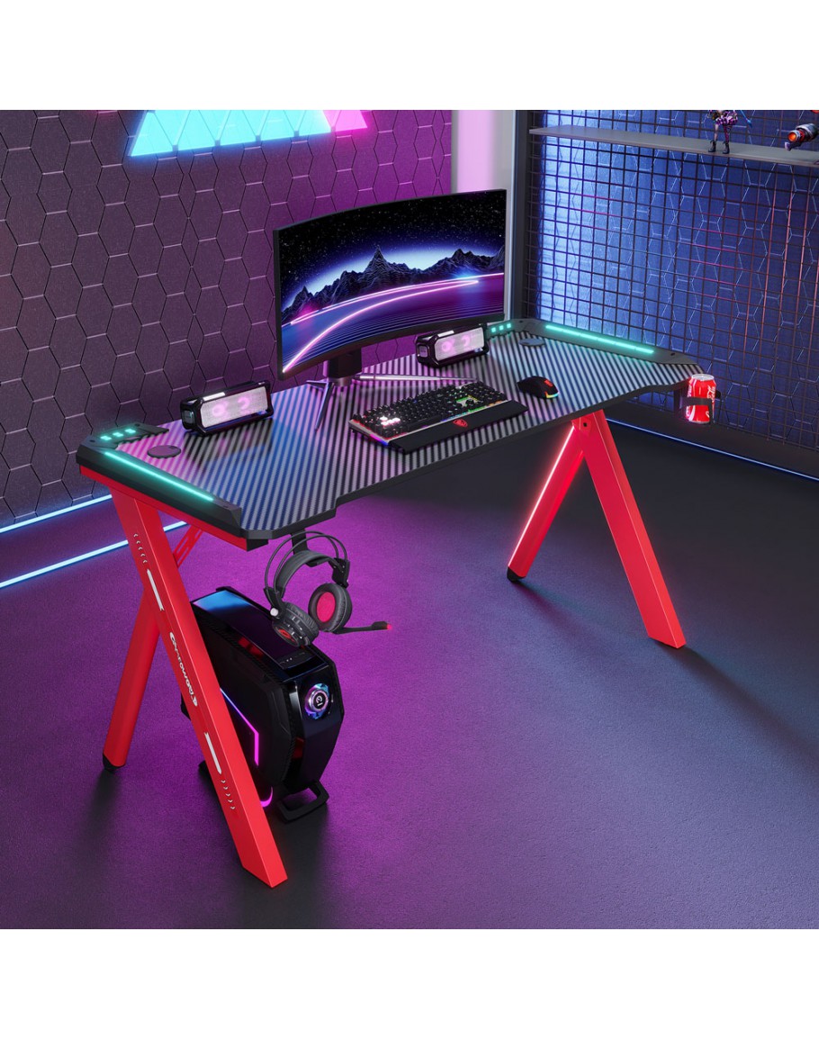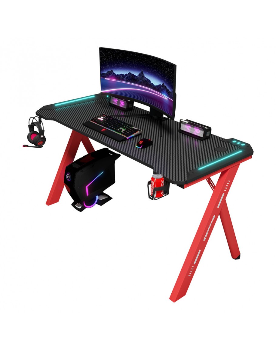 Геймърско бюро 4 в 1 включва поставка за чаша, кука за слушалки и RGB осветление.