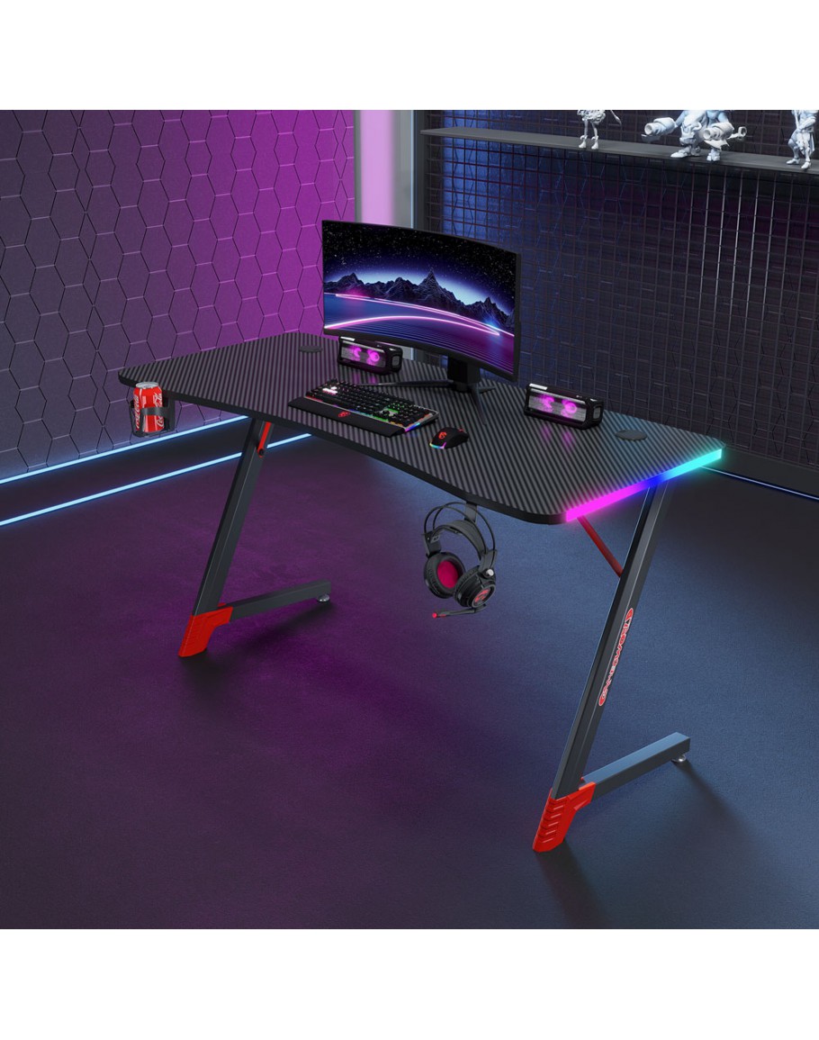 Геймърско бюро 4 в 1 включва поставка за чаша, кука за слушалки и RGB осветление.