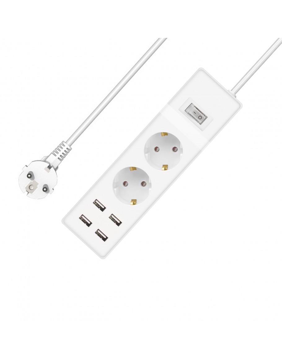 Удължител No brand, 2 гнезда, 250V, 16A, Кабел, 1.5m, 4 x USB F, С ключ, Бял - 17883