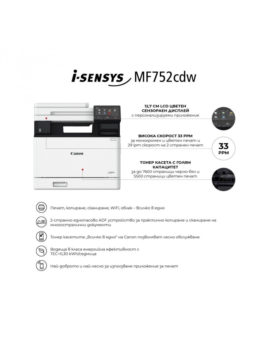 | Други | Software and Printer Management: MF Scan Utility, Remote User Interface (RUI), Department ID Management, Toner Status Tool, iW Enterprise Management Console, eMaintenance |